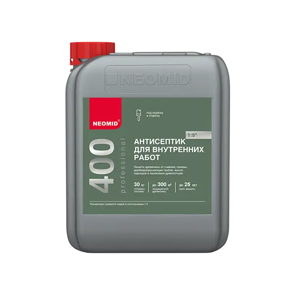 NEOMID 400 ECO — новое высокоэффективное деревозащитное средство на водной основе для внутренних работ. Предназначено для усиленной защиты древесины на срок до 25 лет от гниения, поражения дереворазрушающими и деревоокрашивающими плесневыми грибам.