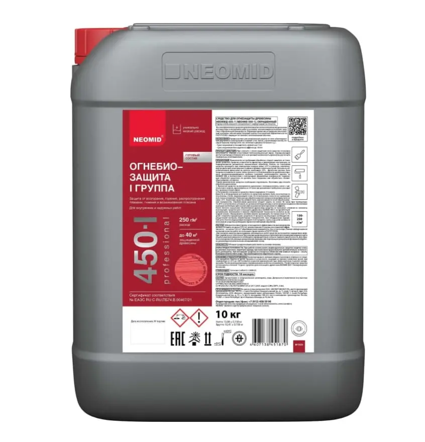 Средство для огнебиозащиты древесины «Неомид 450-1» – высокоэффективное средство для огнезащиты и антисептирования древесины для наружных и внутренних работ в условиях, исключающих вымывание состава с обработанной поверхности. Переводит древесину в трудновоспламеняемый и трудногорючий материал, обеспечивая I (первую) группу огнезащитной эффективности по ГОСТ Р 53292, защищает от гниения, возникновения плесени.