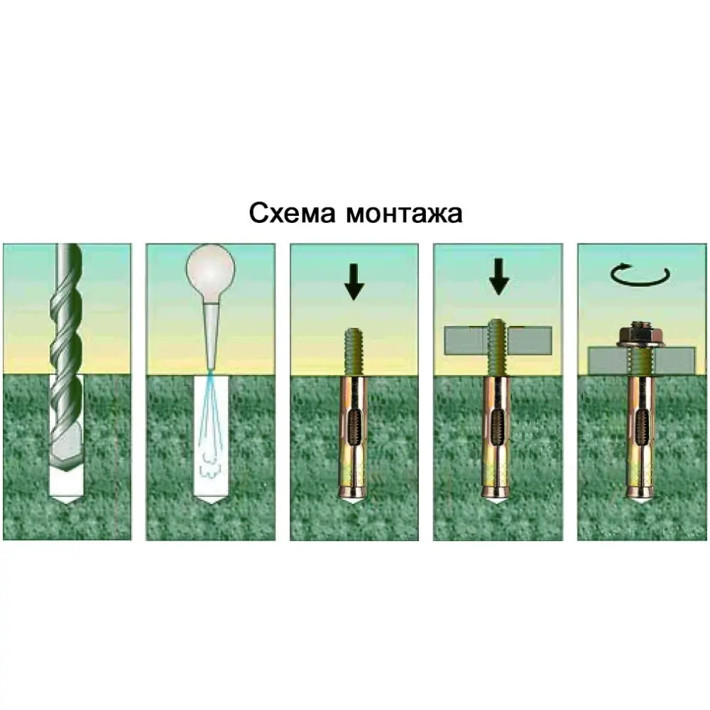 Представляет собой шпильку с шайбой и гайкой, на котором установлена лепестковая распорная гильза с резьбой на внутренней части.