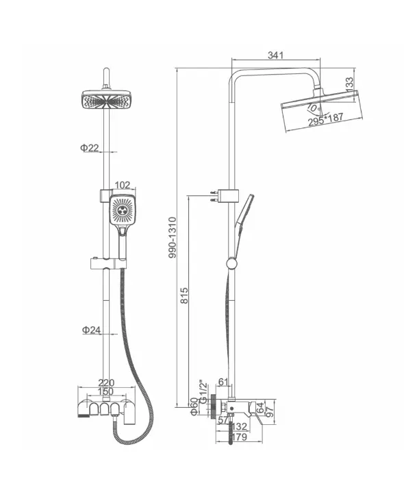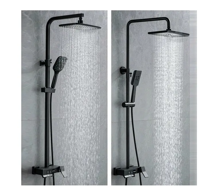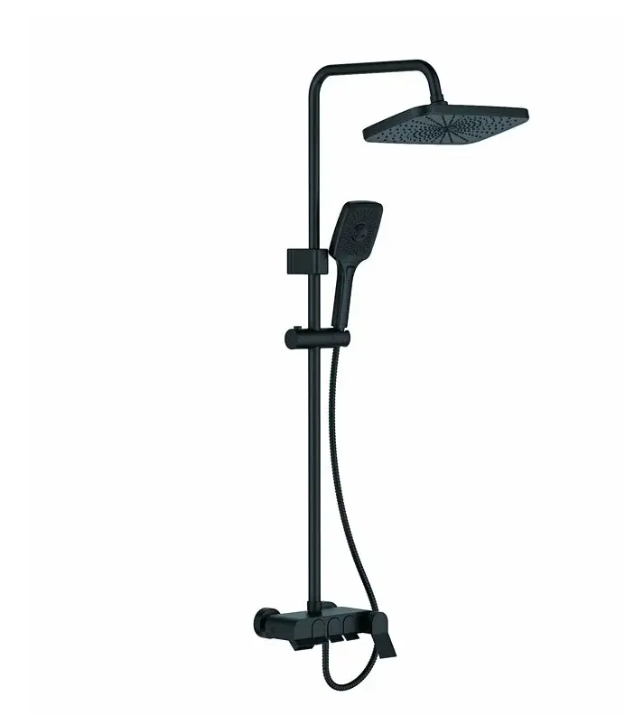 Комплектация: смеситель; душевая стойка; верхний душ; душевая лейка; душевой шланг; держатель для душевой лейки; настенный держатель; отражатели; эксцентрики