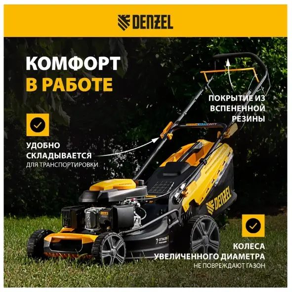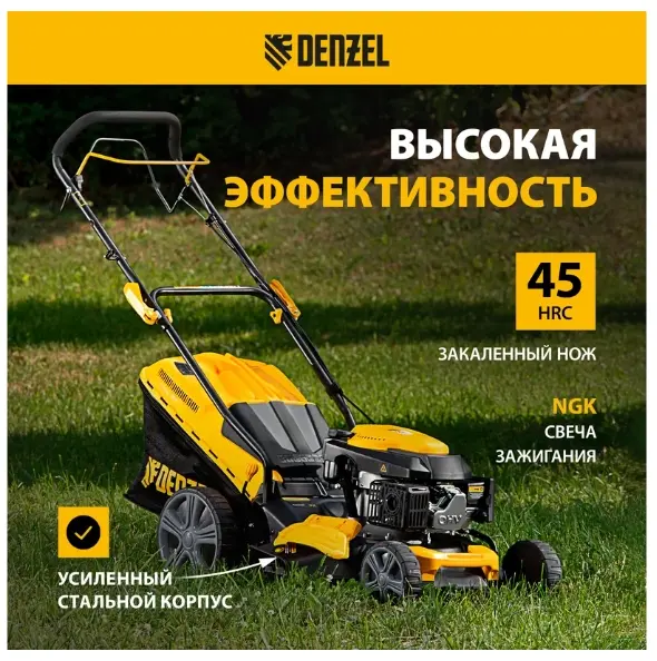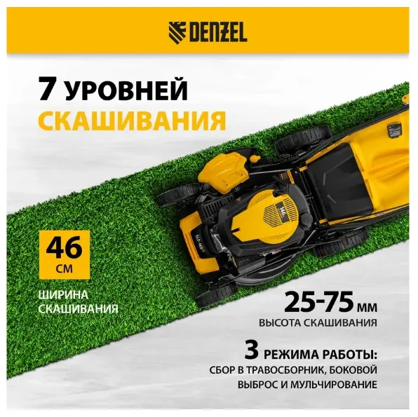 Двигатель Denzel обеспечивает высокую скорость вращения ножа в 3000 об/мин, разумно потребляя топливо. Одного бака хватает на 40-60 минут работы. Ширина скашивания травы за один проход составляет 46 см — таким образом, за 1,5 часа Вы обработаете около 2500 кв. м. Косилка формирует газон высотой от 25 до 75 мм. Всего доступно 7 уровней скашивания, поэтому можно создать как спортивную площадку, так и элитный партерный газон.