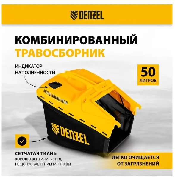 Газонокосилка бензиновая Denzel GLD-460SP 58803 с двигателем объемом 146 куб.см, с приводом, отличается шириной прохода 46 см, имеет 7 уровней скашивания и оборудована травосборником на 50 л. Предназначена для срезания и мульчирования травы на приусадебном участке. Усиленная дека, увеличенный диаметр колес и прочный нож обеспечивают эффективное окашивание сложной территории с зарослями и стеблями. При систематическом применении газонокосилка предотвращает распространение сорняков на участке.