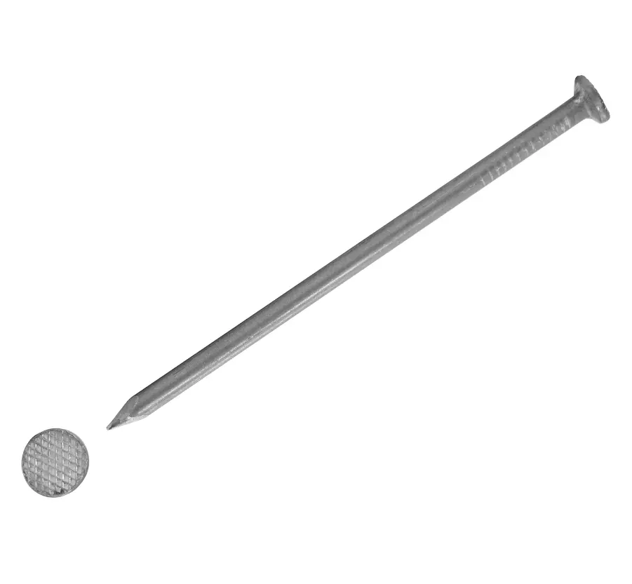 Гвоздь представляет собой длинный и прямой стержень с небольшими неровностями рядом со шляпкой, что улучшает качество соединения.
