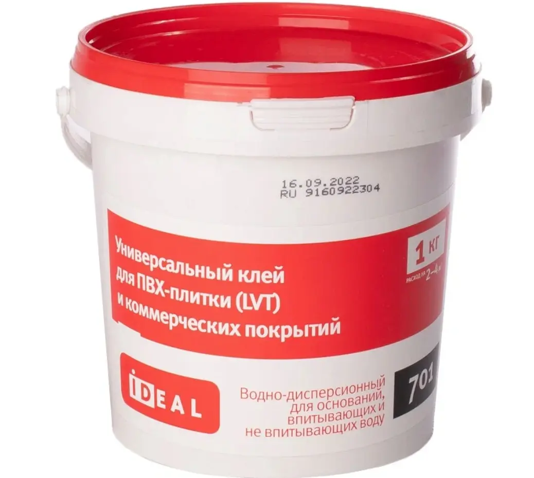 Эффективный акриловый клей для напольного покрытия "IDEAL 701" предназначен для фиксации к основанию гетеро- и гомогенных напольных ПВХ покрытий на впитывающие и не впитывающие влагу основания.