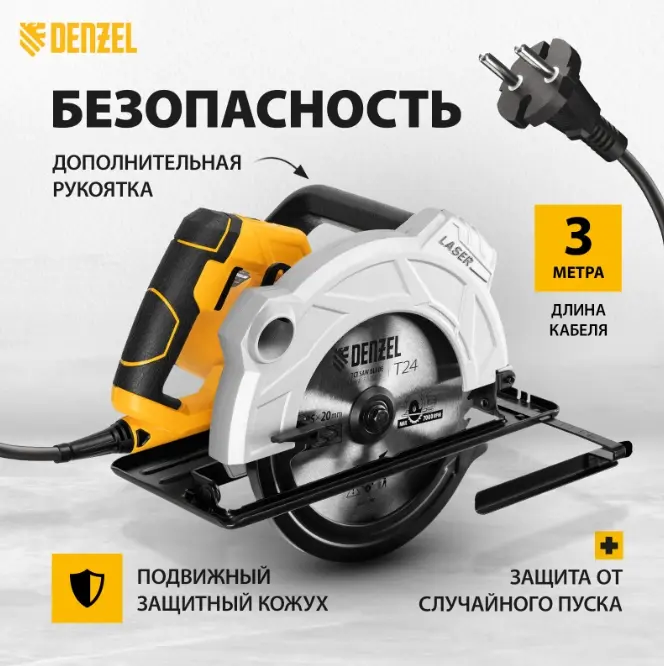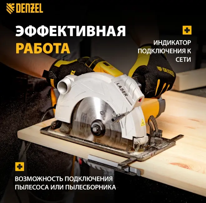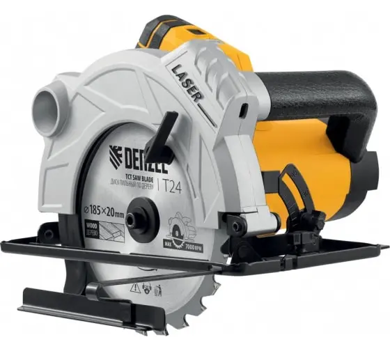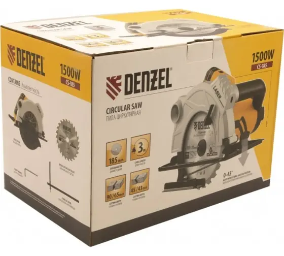 Циркулярная пила Denzel CS-185 27303 мощностью 1500 Вт с пильным диском диаметром 185 мм предназначена для раскроя фанеры, быстрого прямого реза листового материала на основе древесины, ДСП и ДВП.