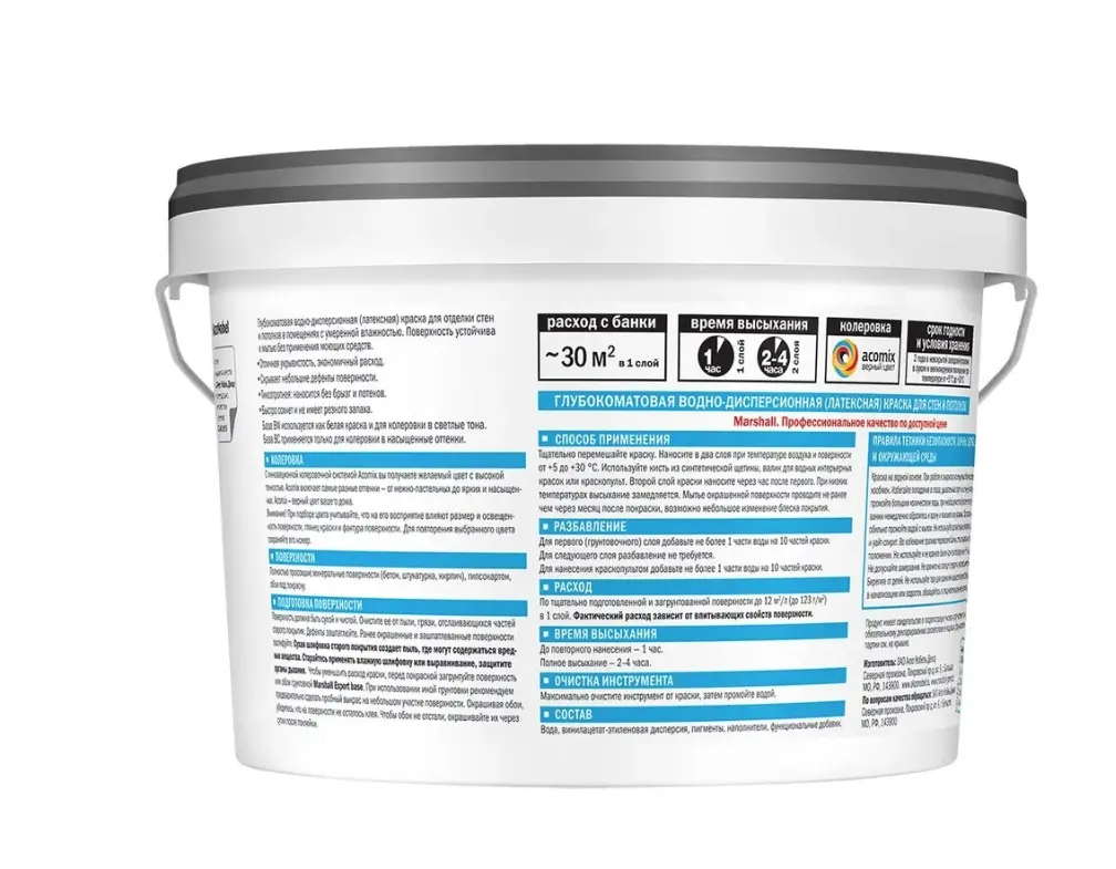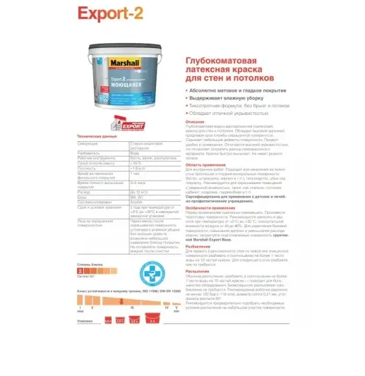 Глубокоматовая водно-дисперсионная (латексная) краска для стен и потолков. Обладает высокой адгезией, продлевая срок службы окрашенной поверхности. Скрывает небольшие дефекты поверхности. Продукт удобен в применении. Отличается высокой укрывистостью, что позволяет сократить расход лакокрасочного материала. Краска быстро высыхает. Не имеет резкого запаха.