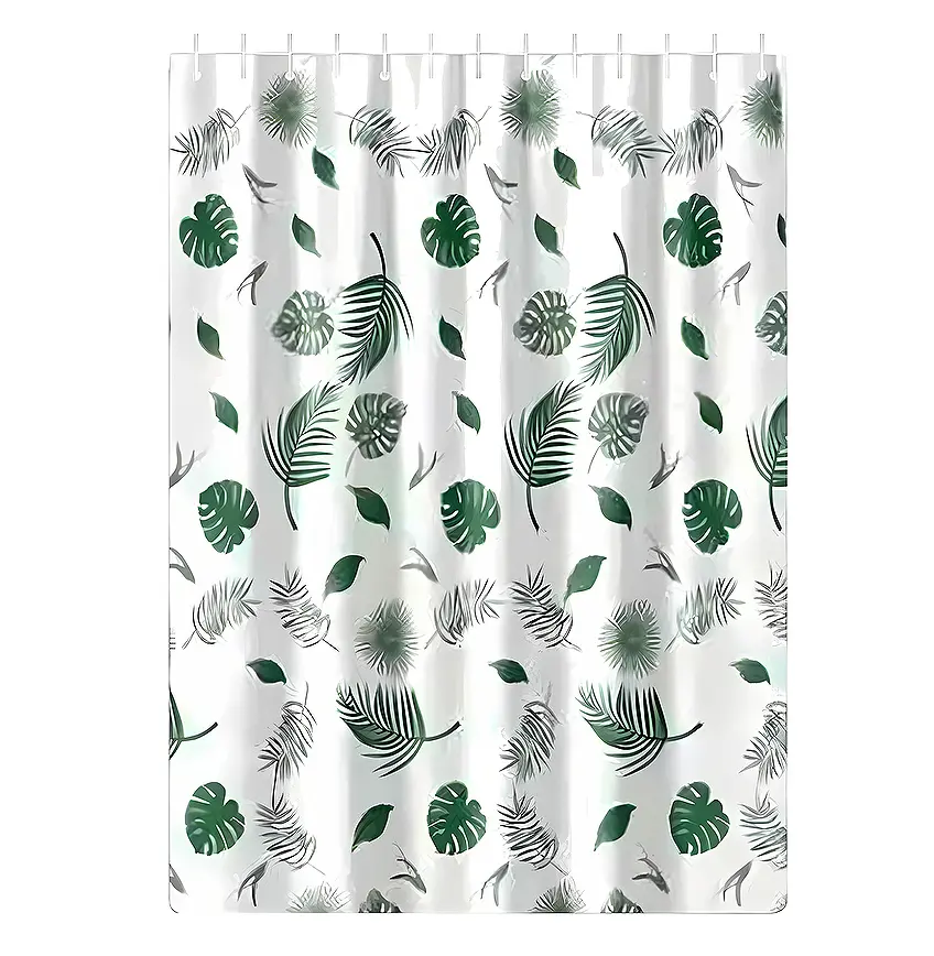 Изготовлена штора из прочного полиэстера, что гарантирует ее долговечность и стойкость к воздействию воды и влаги. Бело-зеленый цвет декора в виде листьев придает шторе приятный и свежий вид, создавая атмосферу комфорта и спокойствия в вашей ванной комнате.