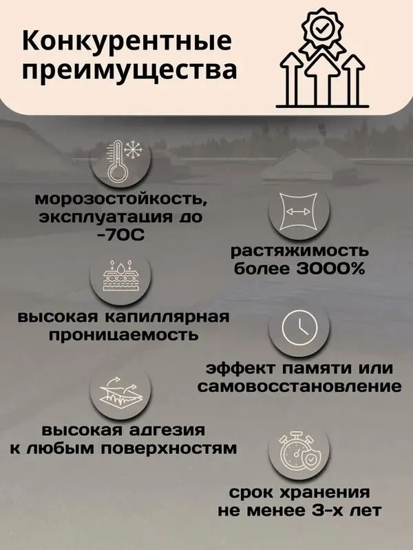В отличие от традиционных гидроизоляционных материалов, «Жидкая Кровля–быстрый ремонт» характеризуется очень низким коэффициентом собственного водопоглощения (КСВ). Фильтрация влаги через покрытие, образуемое Композицией, практически отсутствует, даже при длительном контакте с водой, когда на крыше собираются лужи, или лежит мокрый снег.
