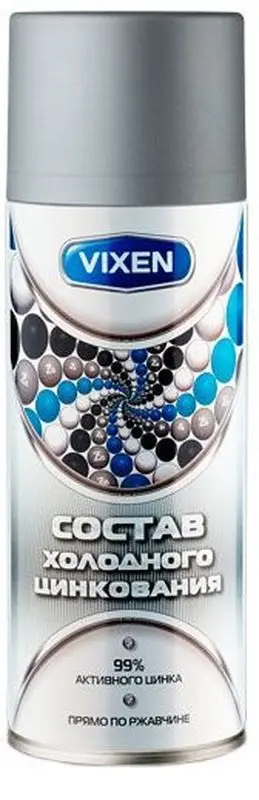 Аэрозоль холодного цинкования "Vixen" - профессиональный состав с высоким содержанием активного цинка (до 99%). Предназначен для антикоррозийной обработки металлов, наиболее подверженных воздействию внешних разрушающих факторов: морской и пресной воды, водных растворов солей, а также этилового спирта. Обеспечивает пассивную (барьерную) и активную (катодную) защиту металлическим поверхностям. Значительно снижает риск возникновения подслойной коррозии. Образует на грунтуемой поверхности тонкое, но прочное и равномерное покрытие, которое обладает высокой эластичностью, устойчивостью к истиранию, не чувствительно к ударным и вибрационным воздействиям.