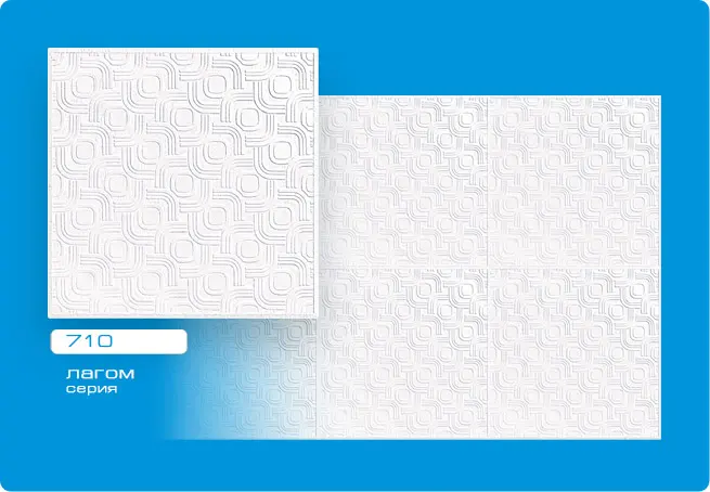 710 прессованная потолочная плитка (штампованная). При производстве плитки используют метод штамповки. На пенополистирольные блоки оказывается прессующее воздействие, вследствие чего образуются изделия, толщина которых 5 мм. Штампованная потолочная плитка имеет ярко выраженную окантовку и смотрится на потолке отдельными квадратами. С помощью прессованной потолочной плитки Вы сможете быстро и бюджетно освежить потолок в квартире или на даче, а также создать шумоизоляцию помещения. Прессованная потолочная плитка при желании отлично красится любой водоэмульсионной краской. Режется плитка обычным канцелярским ножом.