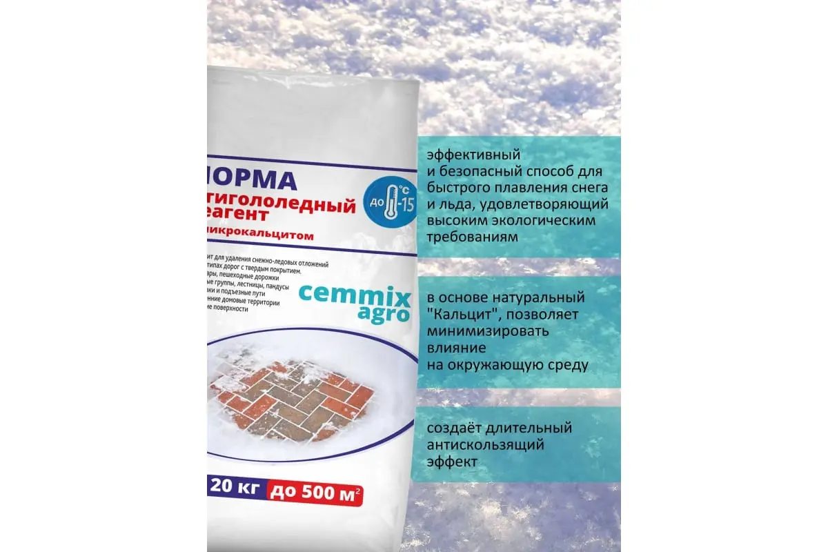 Входящий в состав натуральный «кальцит» позволяет минимизировать влияние на окружающую среду. Оптимальная температура применения до -15 °C. При использовании реагента «НОРМА» от «CEMMIX» лёд тает, а мелкие частицы кальцита, создают антискользящий эффект пролонгированного действия.