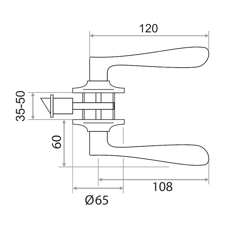 Не оснащена механизмами запирания на ключ или фиксатор. Применяется для фиксации двери, предотвращения ее распахивания в проемах, где нет необходимости запирания.