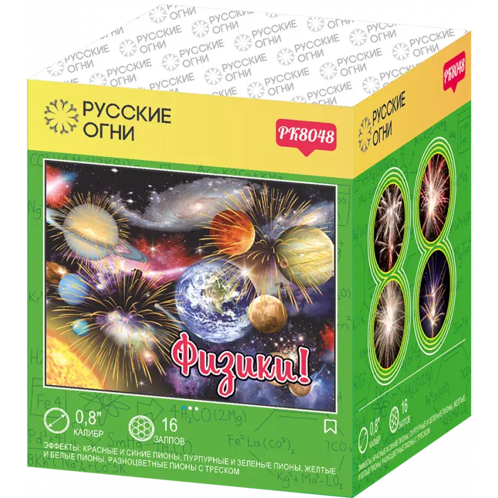 Батарея фейерверков "Физики" имеет ряд разных спецэффектов, они сформируют восхитительную праздничную атмосферу и подарят радость детям и родителям. Изделие содержит 16 зарядов с уникальными спецэффектами: Красные и синие пионы; Пурпурные и зеленые пионы; Желтые и белые пионы; Разноцветные пионы с треском.