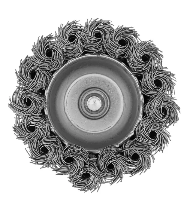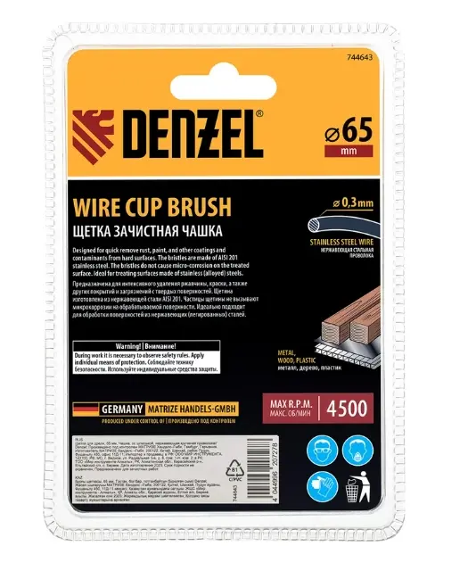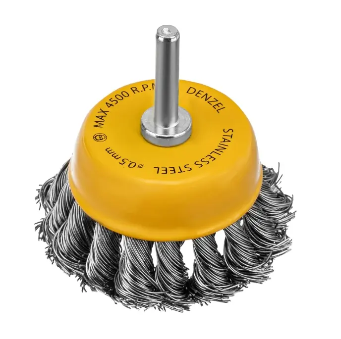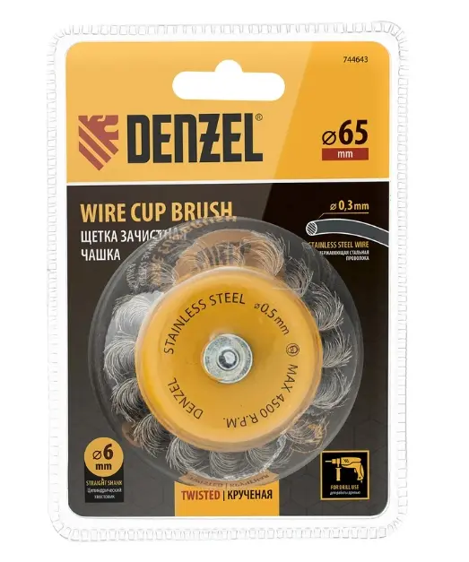Щетка для дрели «Чашка» Denzel 744643 диаметром 65 мм, со шпилькой и щетиной из нержавеющей крученой проволоки, используется для грубой обработки плоских твердых поверхностей из металла, древесины, пластика, идеально подходит для нержавеющей стали. Оптимальна для снятия толстого слоя старой краски, ржавчины, удаления загрязнений. Имеет хвостовик диаметром 6 мм и устанавливается в патрон дрели или прямошлифовальной машины (ПШМ).
