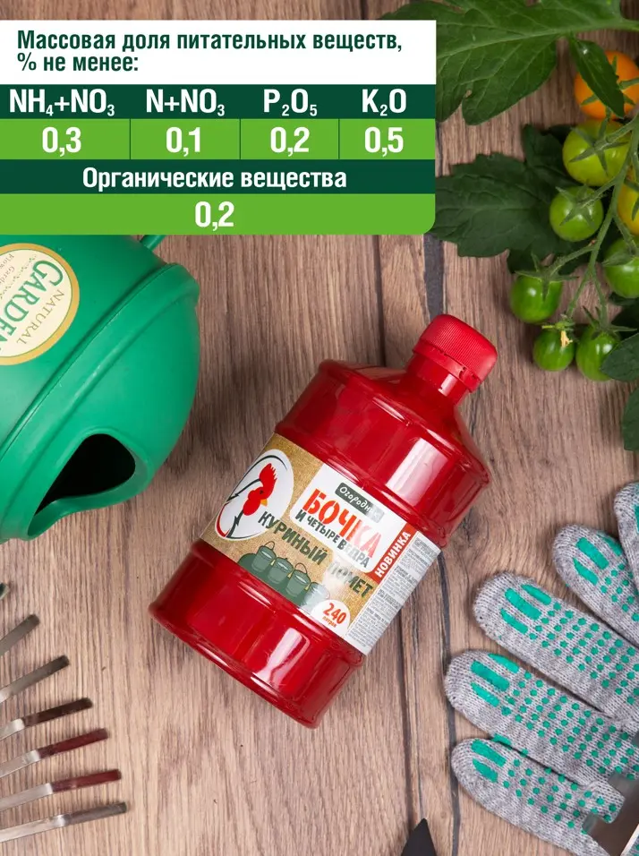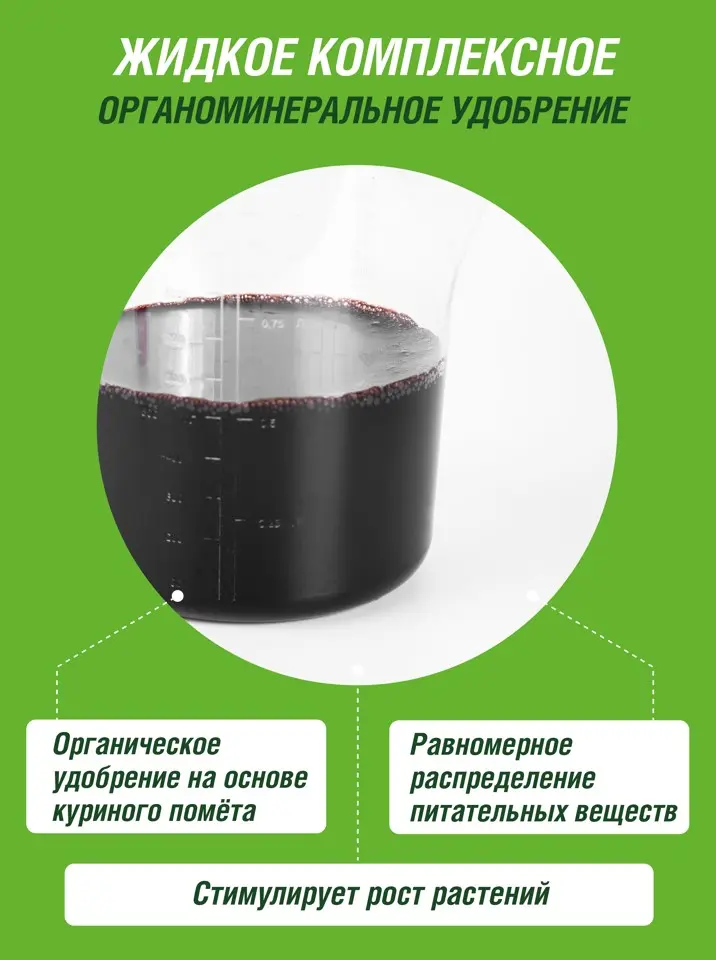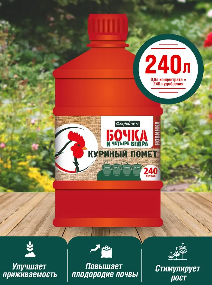 Органическое удобрение на основе куриного помёта для подкормок овощных, плодовых, ягодных и декоративно-цветочных культур. Обеспечивает равномерное распределение питательных веществ 0,6л концентрата = 240л удобрения