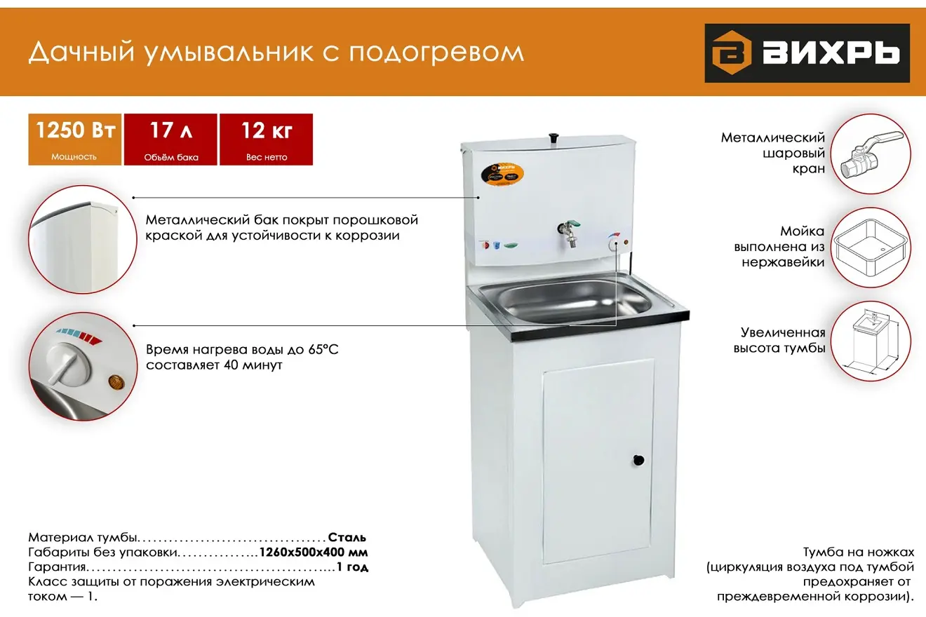 Дачный умывальник с подогревом Вихрь, белый 74/4/1 используется в жилых домах и на дачах, не имеющих централизованного водоснабжения.