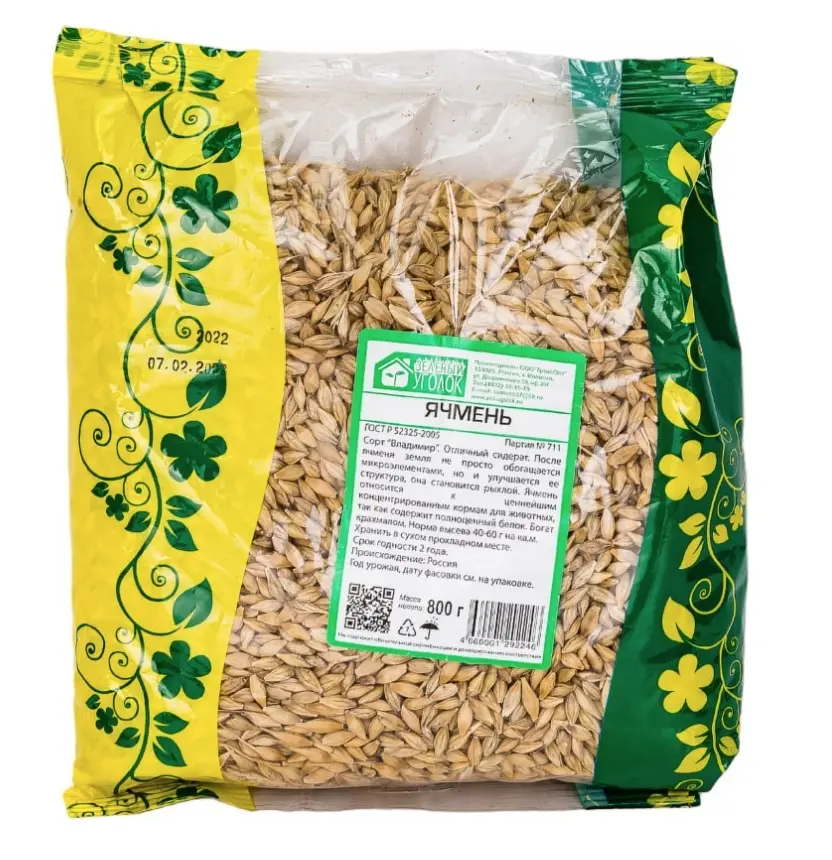 Семена Ячмень, 0.8 кг - отличный сидерат. После ячменя земля не просто обогащается микроэлементами, но и улучшается ее структура, она становится рыхлой. Ячмень относится к ценнейшим концентрированным кормам для животных, так как содержит полноценный белок. Богат крахмалом. Норма высева 2- 2,5 кг на сотку.